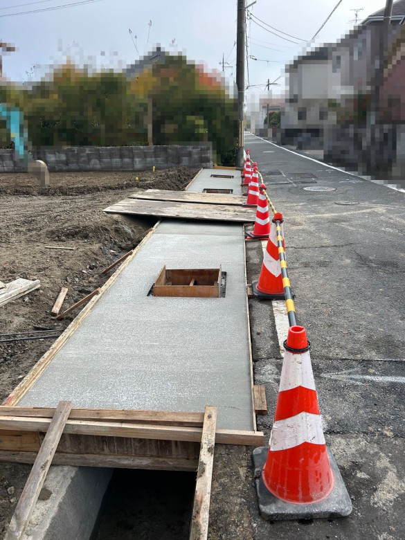 【施工中】 上・下水道、ガスの引込工事及び、敷地前の道路側溝に占用橋を設置します。